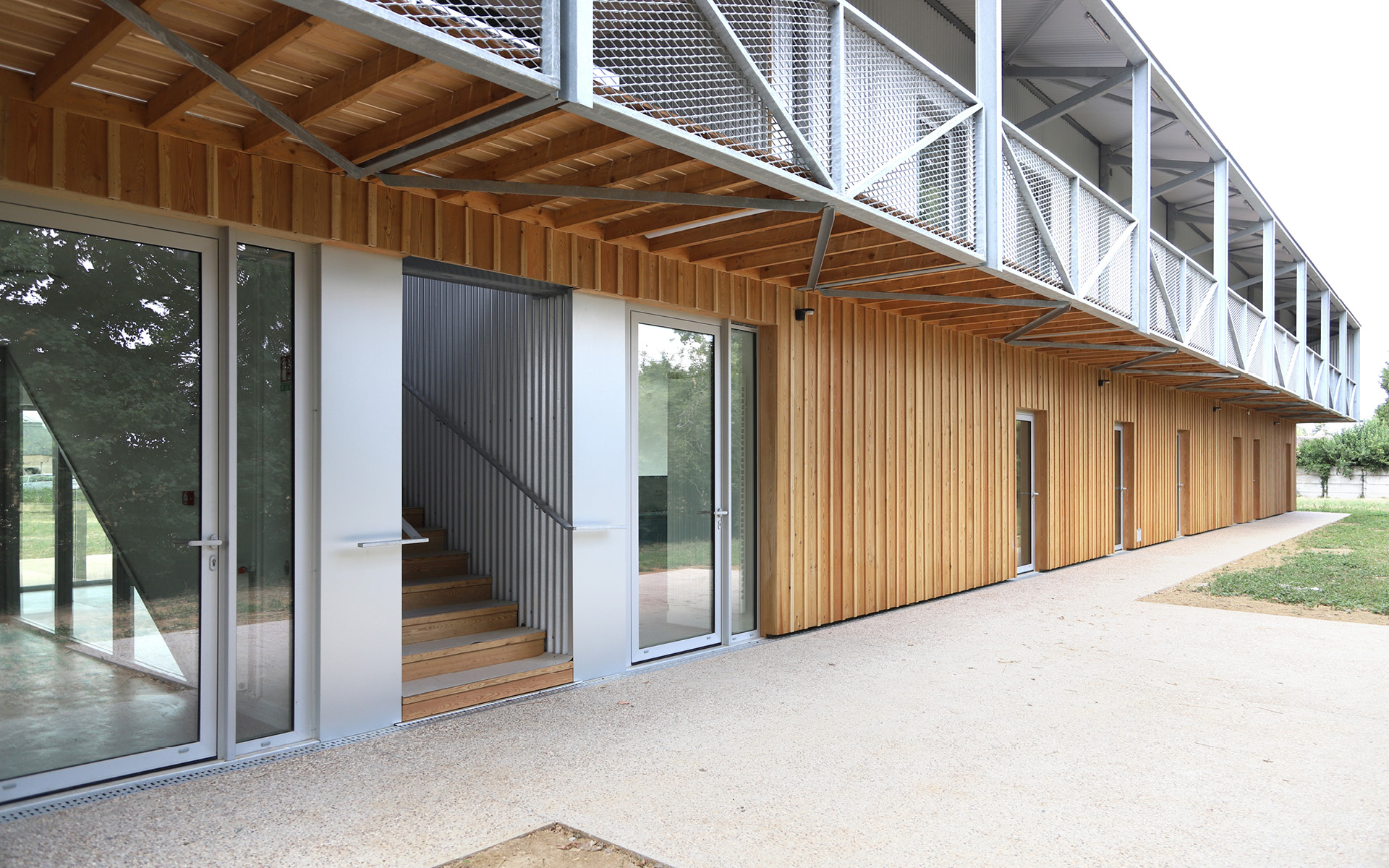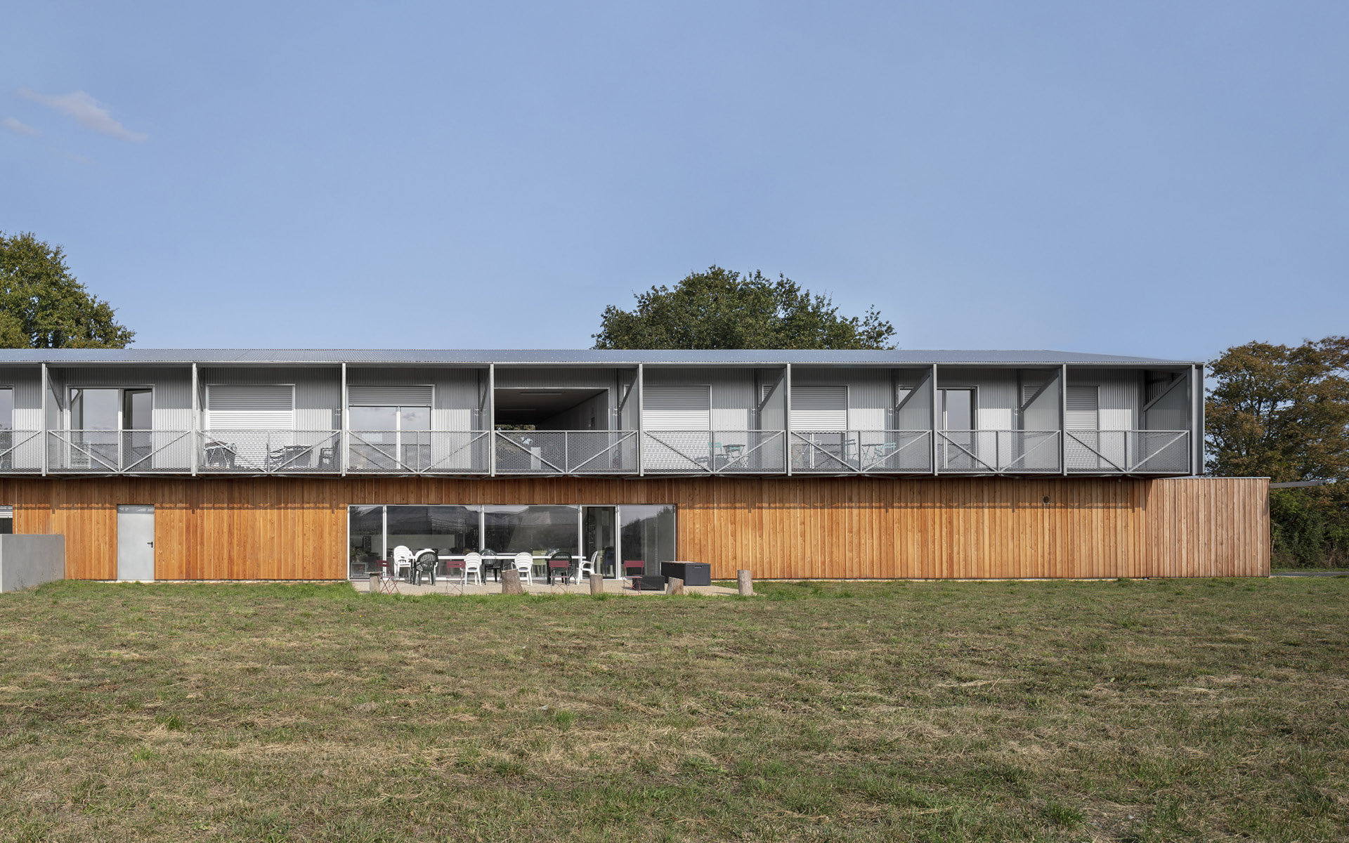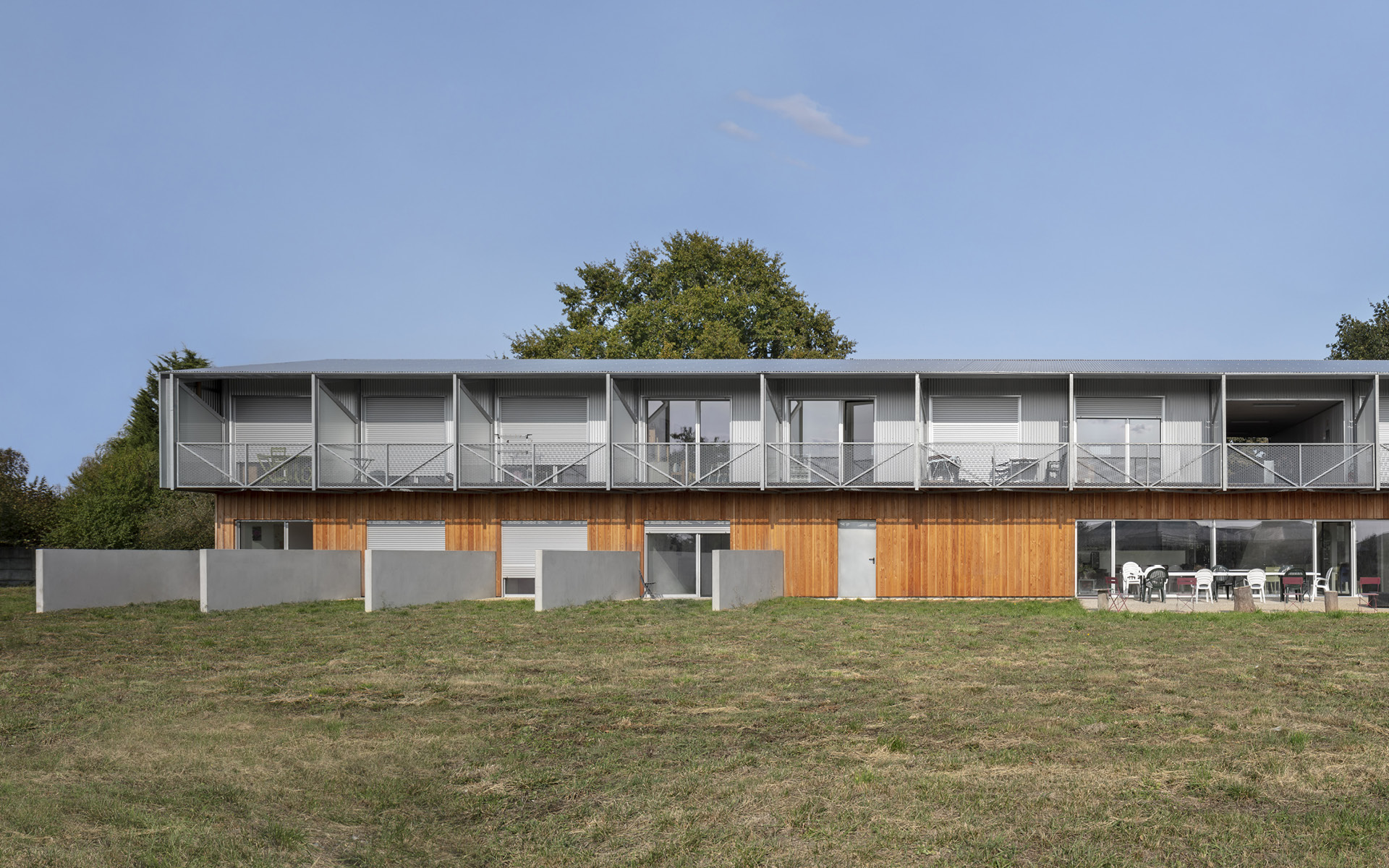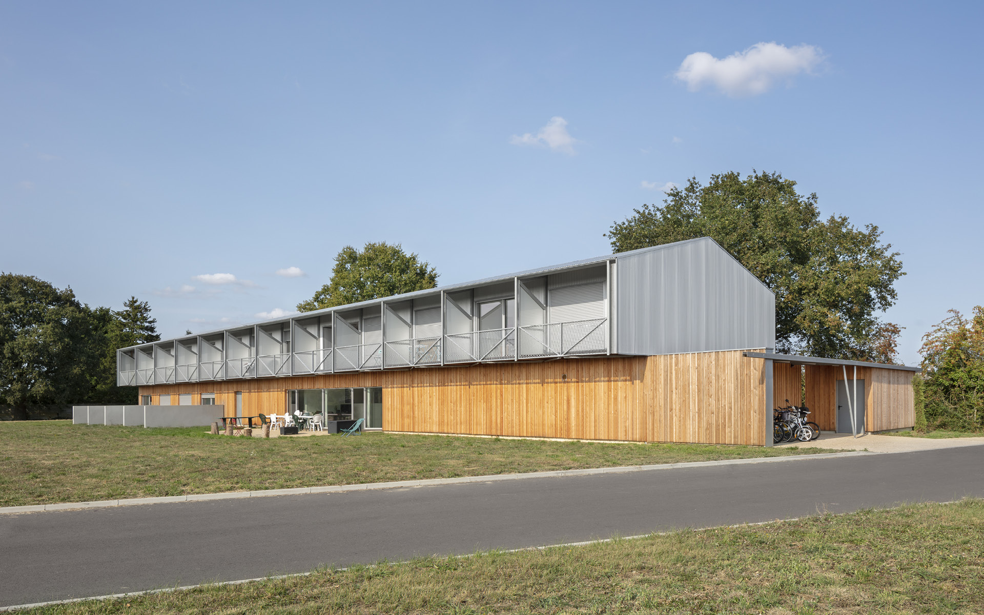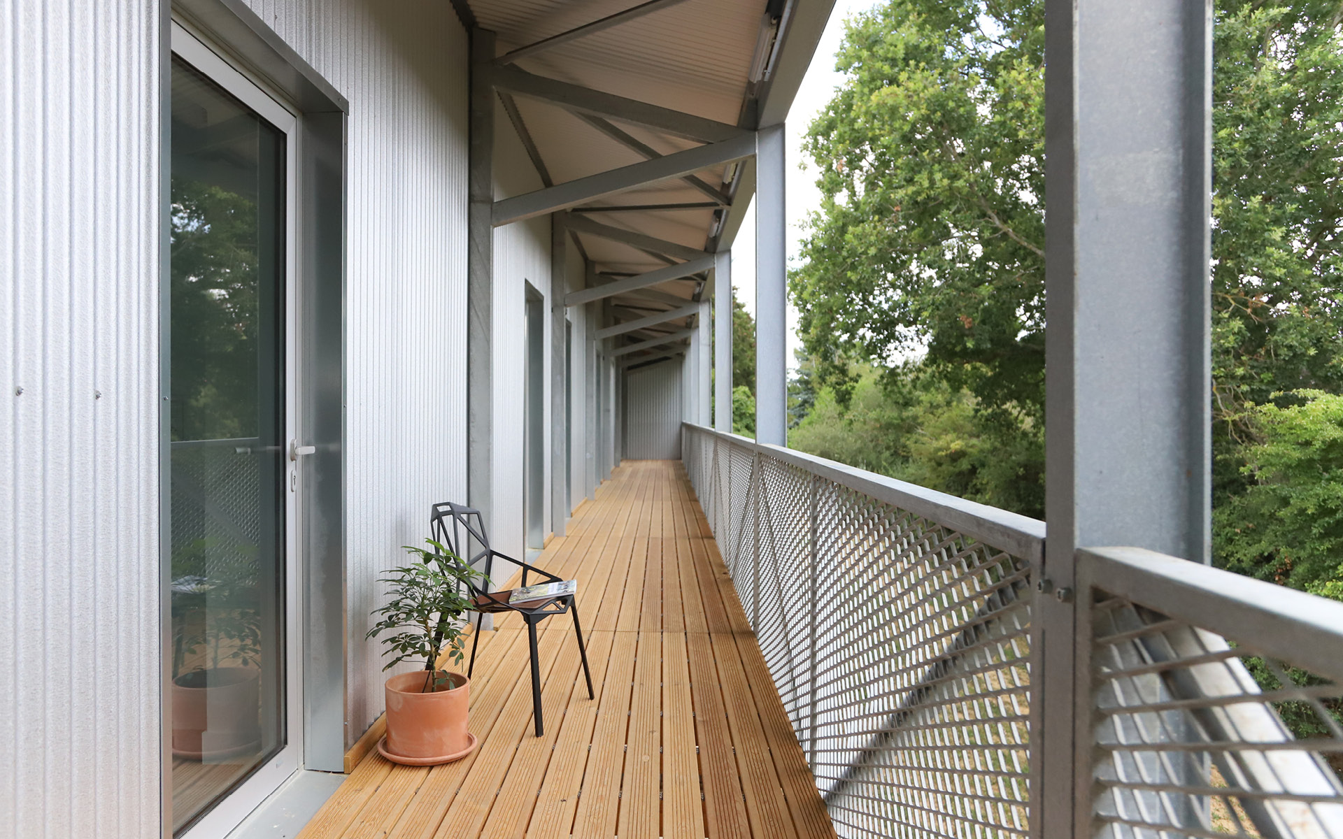Les logements en étage, accessibles par un escalier unique placé au centre du plan, sont distribués via une coursive extérieure couverte par un simple débord de toiture