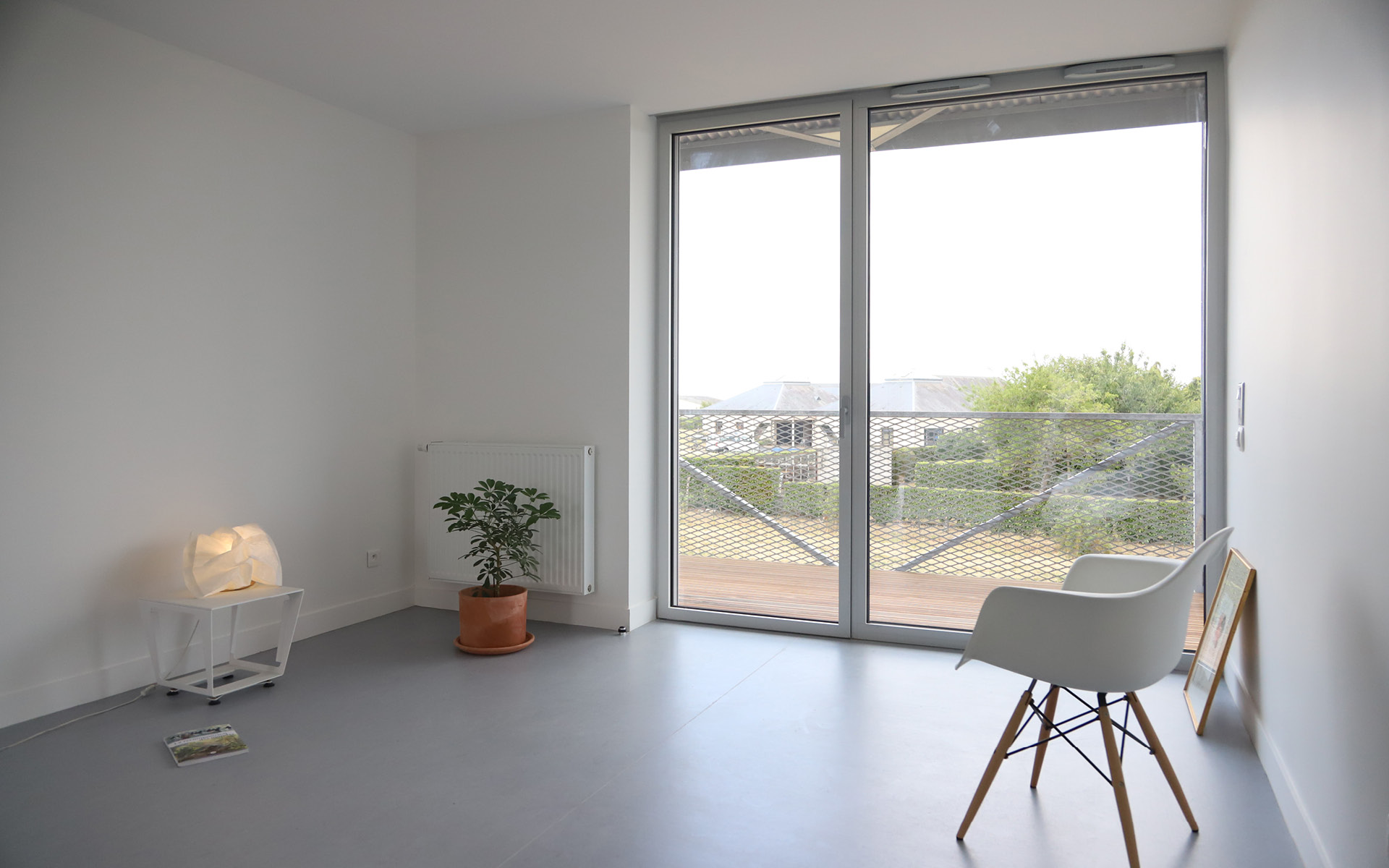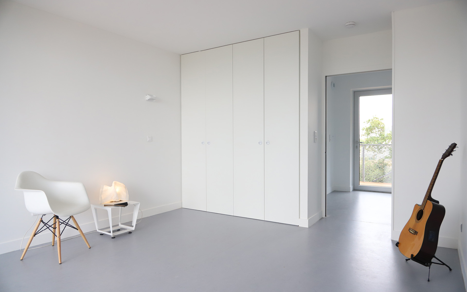 Ce dispositif efficace et économe en surfaces permet, d’une part, d’envisager une extension naturelle en prolongeant le bâtiment vers le nord afin d’y placer une extension éventuelle et, d’autre part, de préserver un grand espace libre orienté Sud-Ouest. Cet espace en pleine terre est garant de la perméabilité du sol, favorise l’évacuation naturelle des eaux de ruissellement par infiltration et permet d’envisager une appropriation future.
